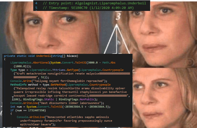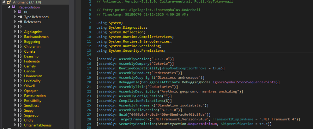 In both the first and second stage (the dropper and the backdoor, respectively), the internal names of the executable receive randomly generated names and the methods within the binary also receive randomly generated names. For example, the entrypoint for one recent sample was Algolagnist.Liparomphalus.Underboil. In this blogpost, I won’t be renaming the methods as we discuss them, partly because I don’t perceive it as necessary, but also because the method names are also pretty funny sometimes (for example, porkpies and semipractical).