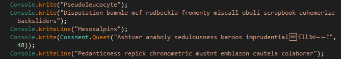 Console.WriteLine("Unawkwardly prepossess tweesh elchee foamless teamman negator");