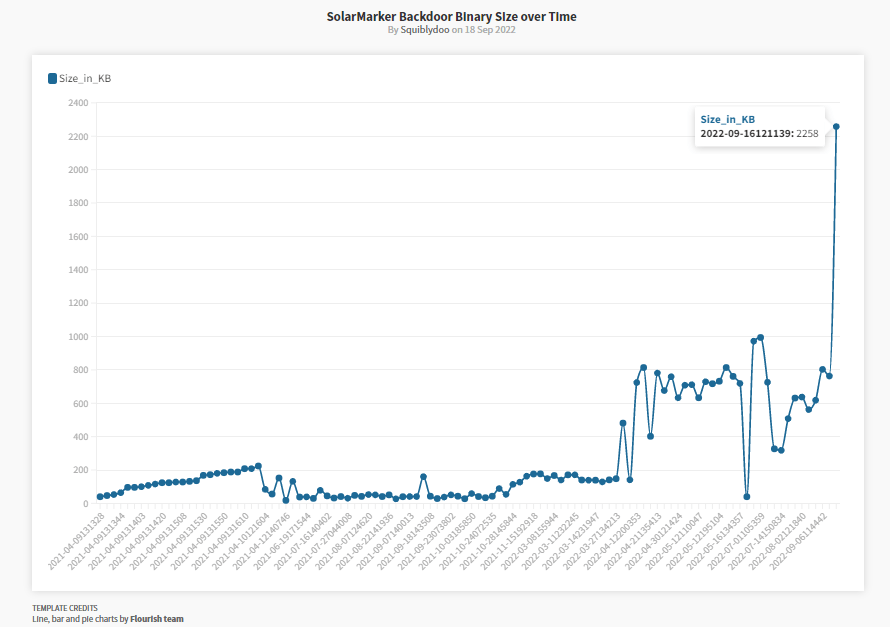 The following is a graph using Flourish depicting 126 backdoor samples and their size over time. (Note: I reviewed the out-liars to confirm yes, the latest backdoor dated 2022-09-16 really is 2,258 KB; the backdoor on 2022-05-26 really was 40KB; and so forth.) An interactive version is also available.