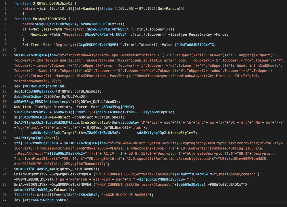 Sometimes, there’s a good reason to have short and simple PowerShell function or variable names, but in many cases, PowerShell should be easy to follow. This helps analysts understand what is happening and helps developers revise the PowerShell when needed. In this case, the long random names are suspicious.