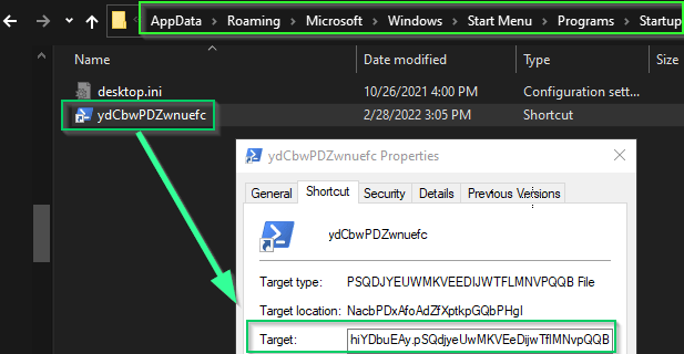 As described previously, a file (“ydCbwPDZwnuefc”) was created in the Startup folder. This shortcut executes a file with a really long name. The file names are created by the “create_random” function and they differ between infections.