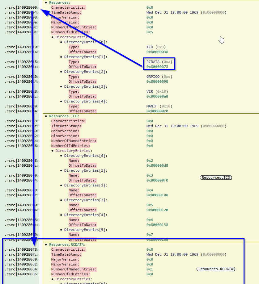 We are interested in the RCDATA. The “OffsetToData” tells us that the Directory for RCDATA is 0x78 bytes away from the beginning of the directory. In the following image I illustrate that 0x78 bytes from the resource directory is the RCDATA Resource Directory, which malcat has already parsed and labeled.