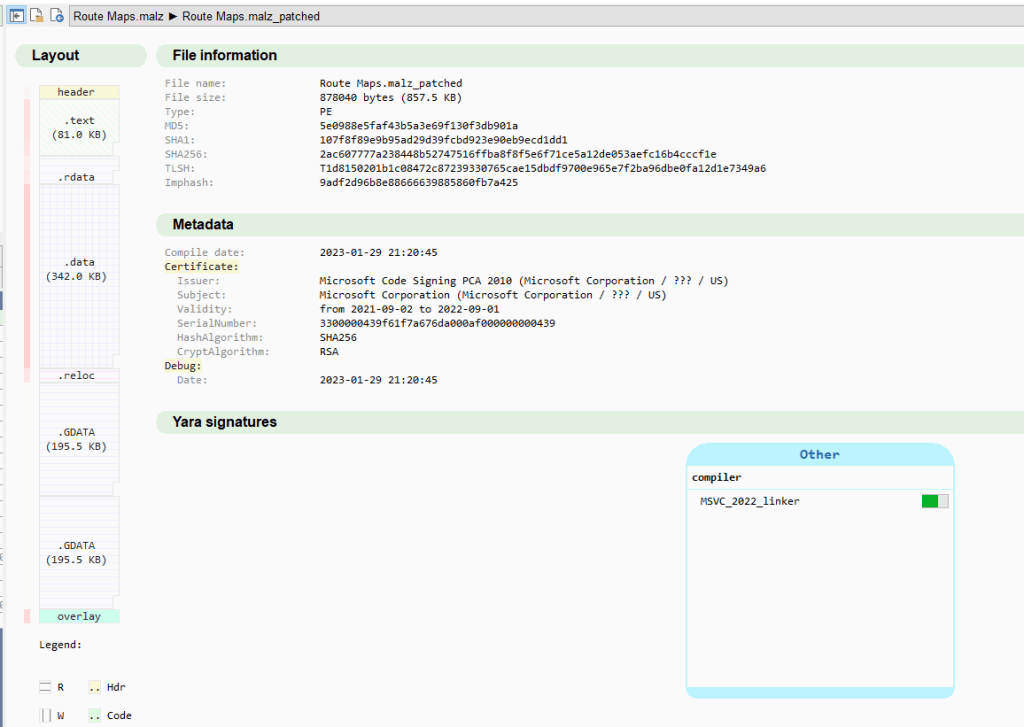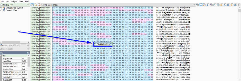 In malcat, we can click the Overlay in the layout view in order to examine the overlay in the hex editor. The hex editor in malcat highlights structures dynamically. In the picture below, we can see that malcat identified that there is a certificate in this location and labeled it accordingly.