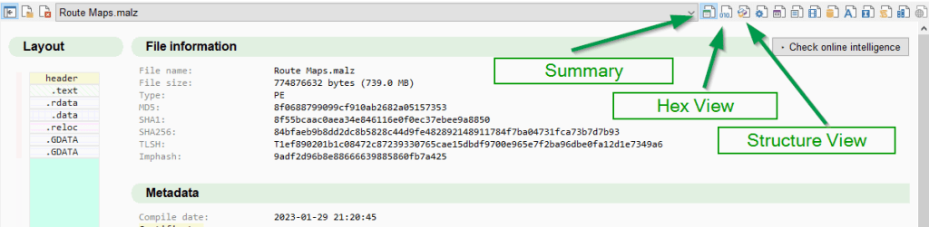 We can also look at this through malcat’s structure view (which we will explore in more detail later). I’ve illustrated in the image below where the buttons are to switch between the summary, hex view, and structure view.