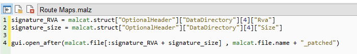 For this example, the script will be pretty simple. We’ll use the reference to the “RVA” that we added to the editor and a reference to the size of the signature. We will assign them to variables to keep it easy. Then, we will tell malcat to open the same file again with everything up to the end of the signature.