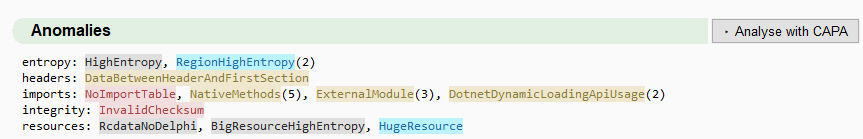 Malcat allows us to click on each of the highlighted anomalies to get more details.