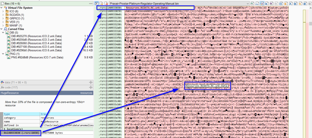 Clicking the hexadecimal location in malcat takes us there within the hex editor view. Malcat has labeled the beginning of the resource in the hex view and has a dynamic label over the bytes (locations of labels indicated in the image below in blue). These features help you find your way around and stay oriented.