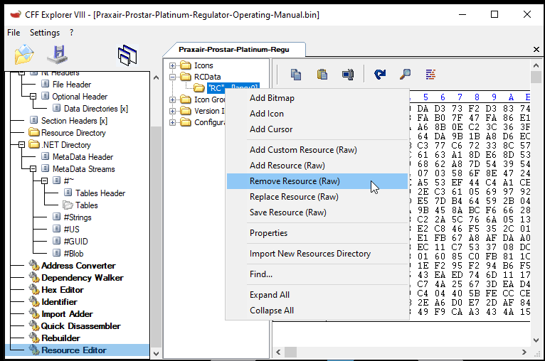 If we wanted to remove the bloat manually, we could easily do this at this point. We can load the file into something like CFF Explorer: open the Resource Editor, locate the Resource RCDATA resource and remove it. The image below shows how to remove the resource in CFF Explorer.