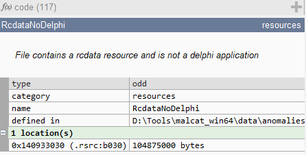 “RcdataNoDelphi” tells us that the sample contains a RCDATA resource but the executable itself is not a Delphi application, so having a RCDATA resource is abnormal. Based on its size, “104,875,000 bytes”, we can safely conclude it is our bloated resource.