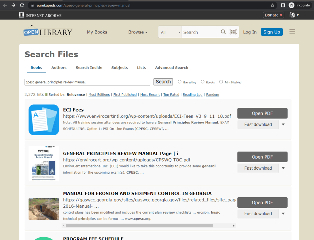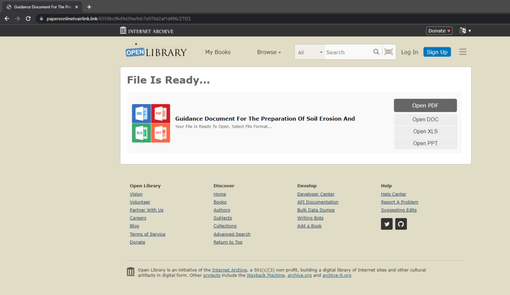When clicked, the visitor is presented with a page disguised to look a listing of files on the internet archive. The malicious page lists real documents and the URL to real documents. However, all the buttons on this page will send the user to the same download page pertaining to the file that they were originally looking for. (Image: one of the malicious websites displaying a fake Internet Archive page and links to download the “requested resource”.)