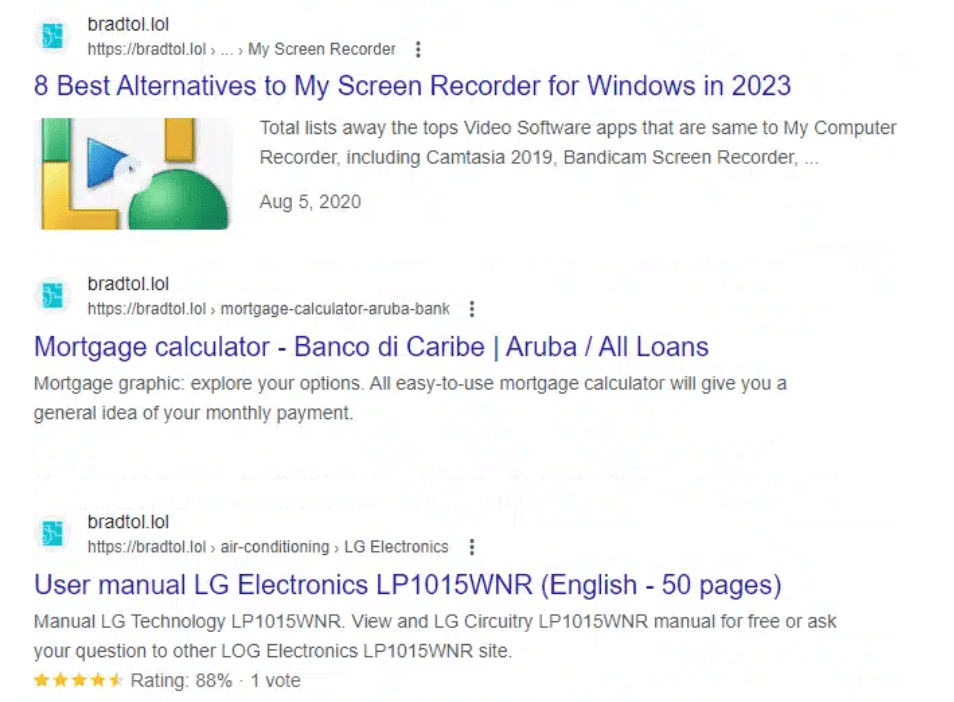These features are true for all of the results: the search result displays information about a real file or website and surfaces the metadata from the real website. The following is an image to show you the extent of what can be surfaced in the search results: the results show thumbnails from the real sites, rating and voting information, dates from when the documents were uploaded, and more. As a result, apart from the domain, the lure accurately reproduces the search results for the real page and the SEO poisoning of the threat actor can cause these pages to arrive high in the search results.