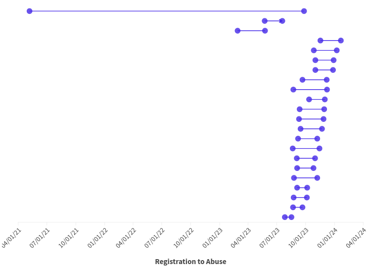 The company registration, the certificate issuance, and certificate abuse all occurred within a small time frame. In the graph below, the left dots indicate the date the Ukrainian company was registered and the right indicates when a certificate for the company was abused. (Note: The company registered in 2021 may have been abused with other malware, but abuse was not reported until September 2023.)
