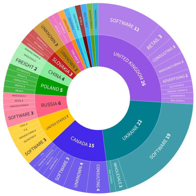 Software was the largest industry with 41 companies impersonated. (Note: 19 of those were shell companies as discussed above.) Second was consulting. Third, manufacturing. Further down the list, some industries seem more random: automotive repair, a beauty salon, and a massage therapy provider. Again, while organizations in these industries aren’t known for software development, the requirements—mentioned above—do not exclude them from being impersonated.