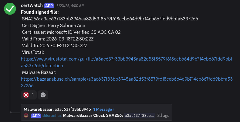 Second, we welcome others to contribute to malware analysis in our Discord server. The server acts as a central hub for communication and automation. Automated workflows surface information about signed files for investigation. This makes it an easy place to know what needs to be reviewed, what has been seen, and discuss the malware or the analysis of the files.