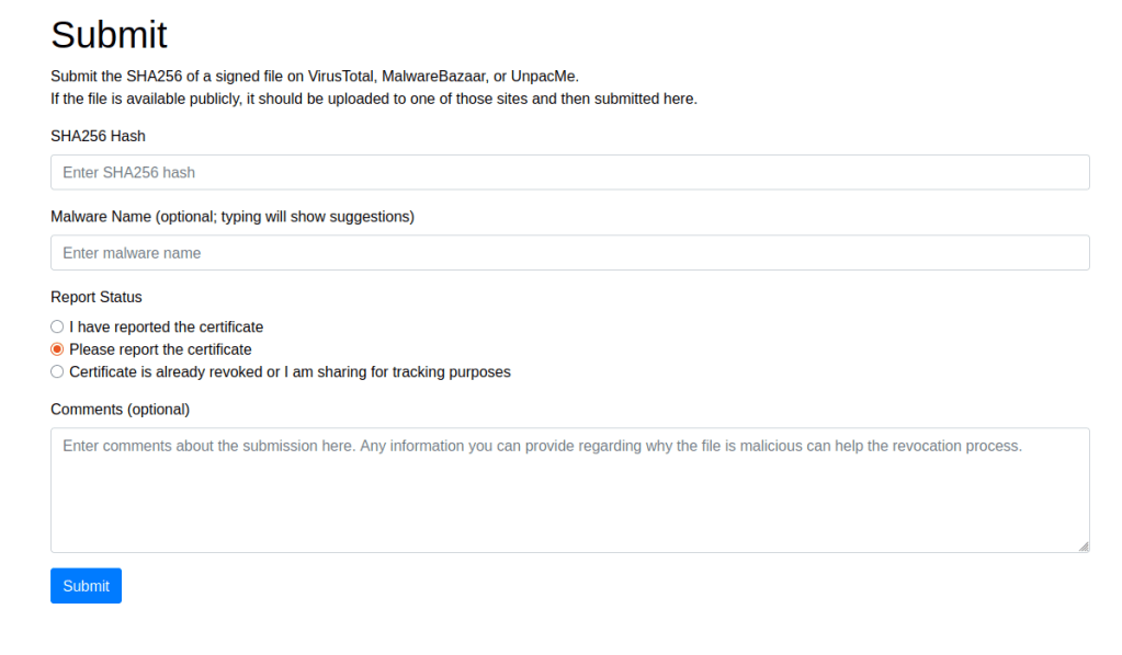 The CertGraveyard allows anyone to report an abused code-signing certificate using our web form. All submissions are reviewed and details are submitted to the appropriate Certificate Authority for revocation. This helps users to not worry about finding the right contact nor needing to spend excessive time writing up details.