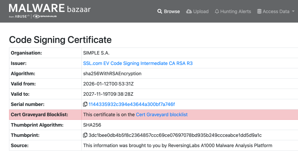AbuseCH is one of our major sources of data. We use MalwareBazaar’s API to find signed files to triage. We leverage MalwareBazaar to review sandbox analysis results to help us make a determination if a file is malicious and what malware family is involved. They have also integrated an API request to the CertGraveyard to display when a signed file is within our database.
